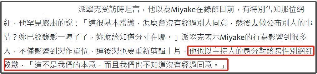 随着风波发酵,带着变性网红照片上节目的女嘉宾道歉了,节目组接连道歉了两次,还有节目助理男主持派翠克,在最新采访里专门又道了一次歉。